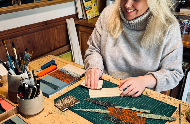 Bruce Wearne’s finely crafted “collection boxes” anchor the exhibition with strong geometric forms built from square and rectangular modules. Made primarily from Australian native timbers (with select exceptions such as camphor laurel and jacaranda), the works celebrate striking contrasts in colour, texture and grain. Traditional joinery and finishing methods sit alongside machine-led precision, while polished aluminium elements add both function and contemporary contrast—handles, lid grips and subtle fixtures. Each piece is further animated by hand-painted panoramas of the Australian landscape, rendered with fine brushes, washes and pens to define delicate details and invite close looking.