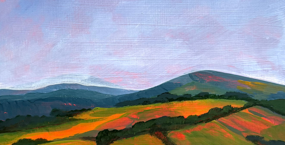 Sue Wearne’s contemporary landscapes—primarily acrylic on board—developed following travel through Ireland’s rolling countryside and hedge-rowed hills, prompting new ways of seeing land and perspective. Drawing connections between Ireland and Gippsland, she uses layered paint, tonal variation and subtle abstraction to evoke movement through place, while reflecting on landscapes shaped by human presence—paddocks, hedgerows and repeated contours—where distant forms can still feel strangely familiar.